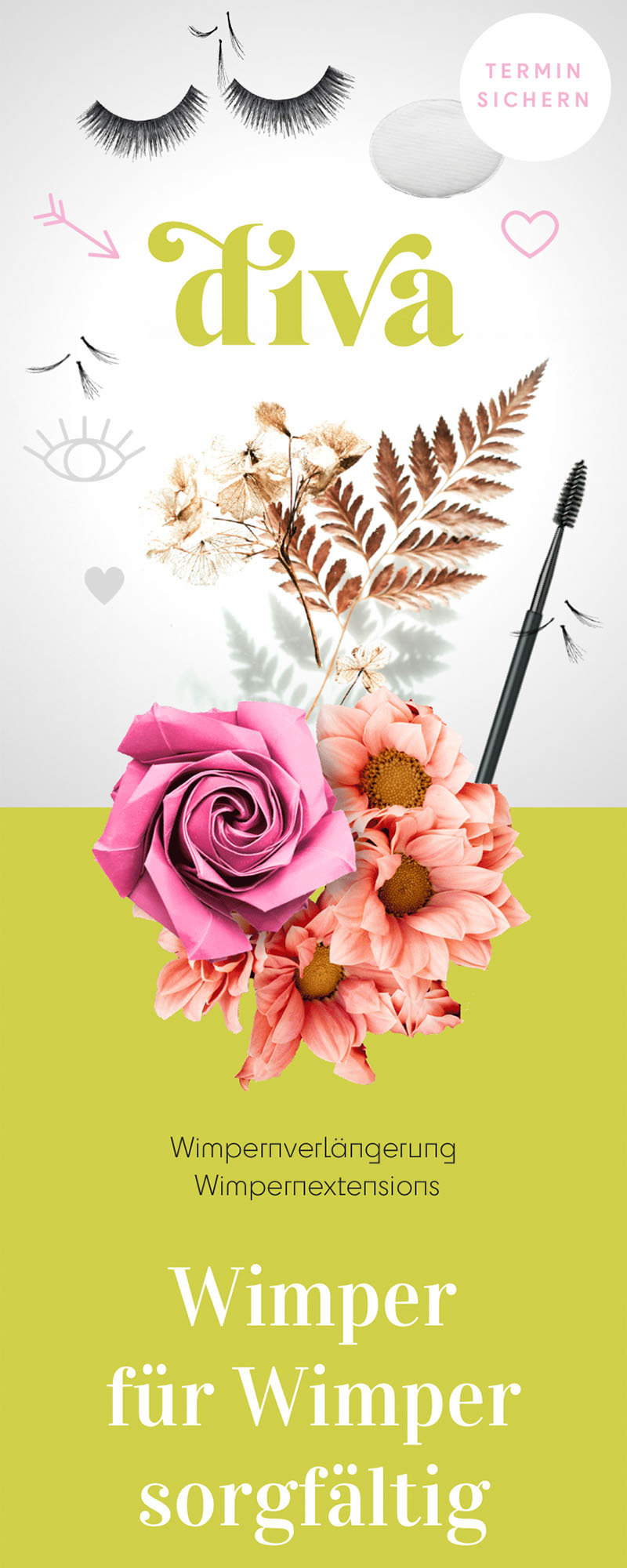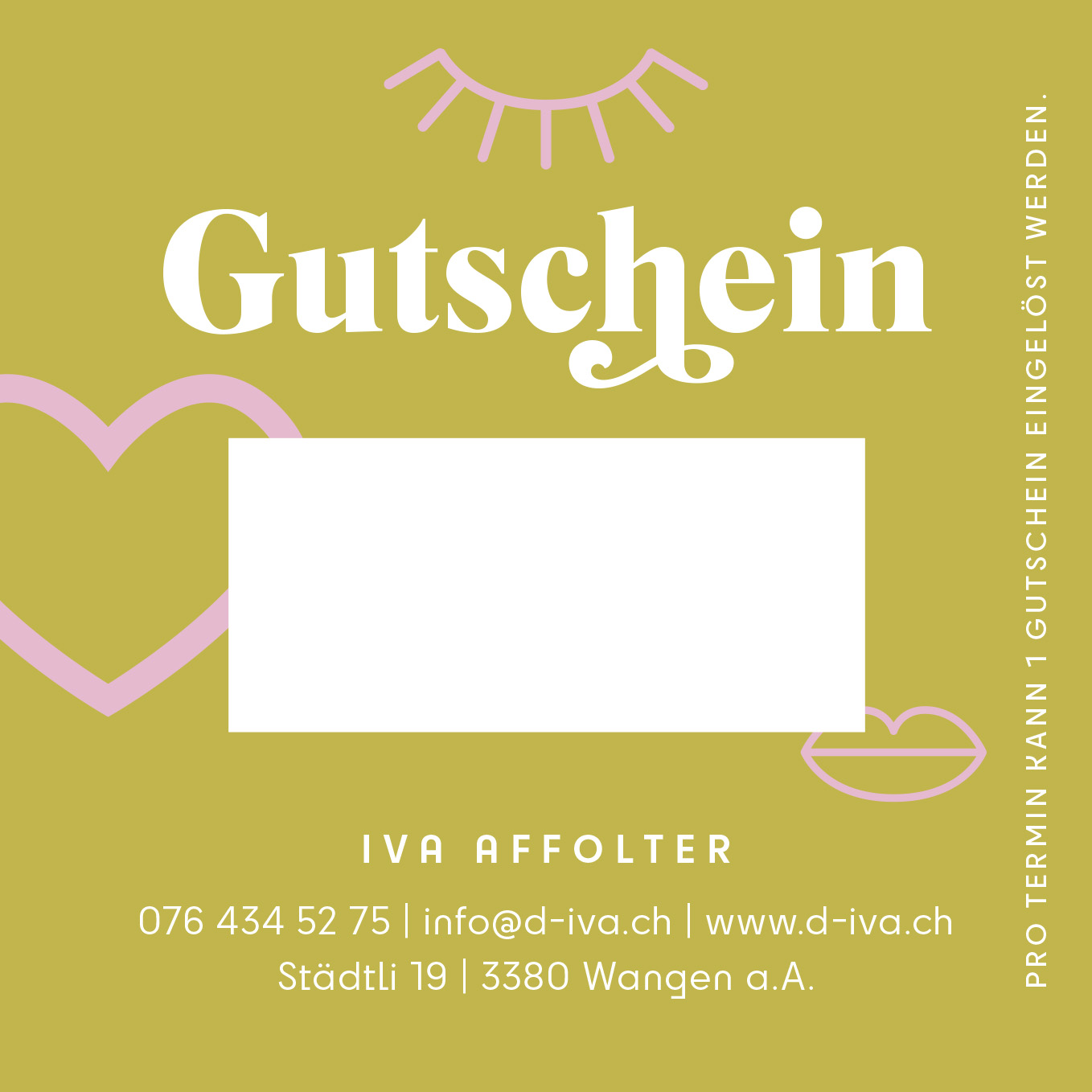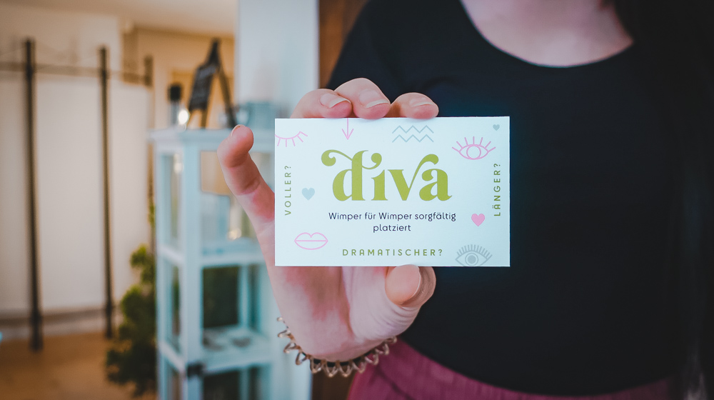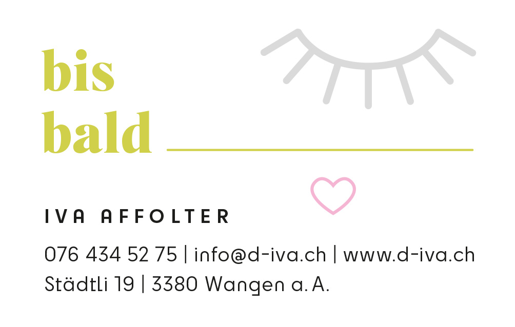 Iva Affolter, so heisst die gelernte Floristin, hat sich schon früh aufgrund einer Gräserallergie in Richtung Beautybranche umgeschult und betreibt seit einiger Zeit ihr Lashextension-Studio. Als sie mich betreffend Namensgebung um Ideen gebeten hatte war schnell klar, dass wir die Gelegenheit nutzen müssen, Aussagen von Kundinnen wortwörtlich zu nehmen: «D’Iva macht die schönste Wimperä», «D’Iva isch super schnäu und vorsichtig“. Also wurde aus IVA offiziell D’IVA.
